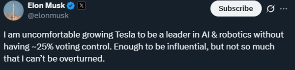 對特斯拉的控制權是馬斯克長期以來的擔憂,他此前多次表示想將持股比例從13%提高至25%,以擁有對特斯拉發展AI和機器人業務的話語權。他認為,25%的持股比例能讓他更好地掌控特斯拉。