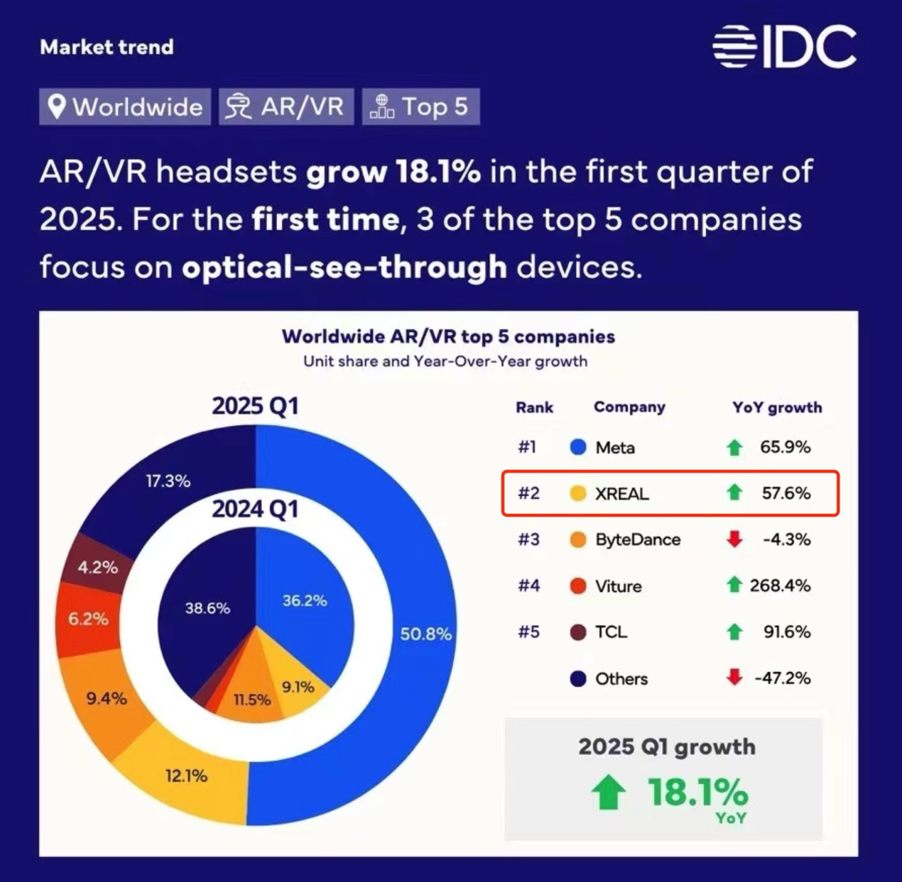 2025年以來,AR/VR賽道日趨熱鬧,市場增長潛力巨大,XREAL的市場表現印證了AR市場尤其是中國企業的增長潛力。根據IDC數據,XREAL連續三年蟬聯AR領域全球銷量冠軍,且在2024年全年市場份額是第二、三、四名的總和。在2025年第一季度,XREAL在全球AR/VR大行業中,份額位居全球市場前二,僅次於Meta,超越字節跳動。
