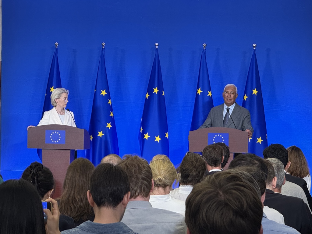 7月24日晚8點,歐洲理事會主席科斯塔和歐盟委員會主席馮德萊恩在歐盟駐華代表團出席新聞發佈會。