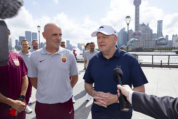 7月13日,上海,阿爾巴尼斯與前澳大利亞國腳、上海海港足球俱樂部主教練凱文·馬斯凱特一同在外灘散步。 視覺中國