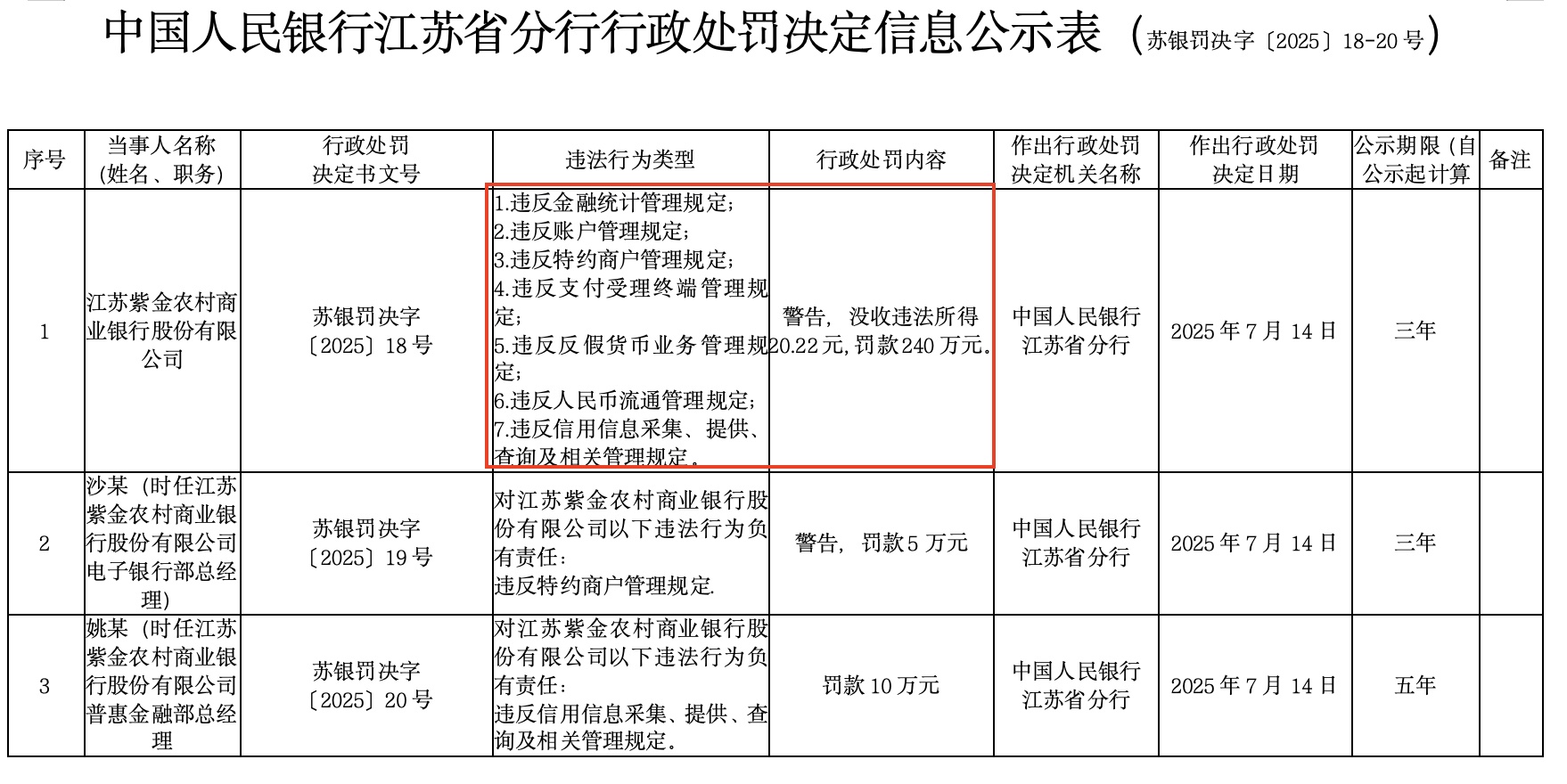 7月18日,中國人民銀行江蘇省分行一紙罰單,將紫金農村商業銀行推至聚光燈下:因七項違規,該行被處以240萬元罰款,兩名時任部門總經理同步領罰,而沒收違法所得僅20.22元。
