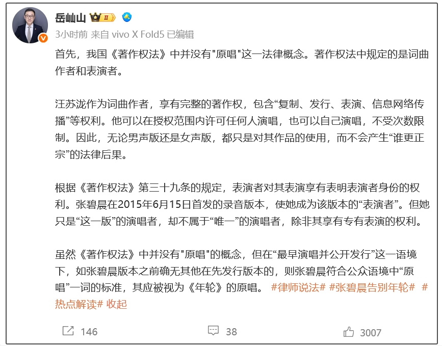 律師解讀《年輪》原唱爭議:我國《著作權法》沒有“原唱”法律概念