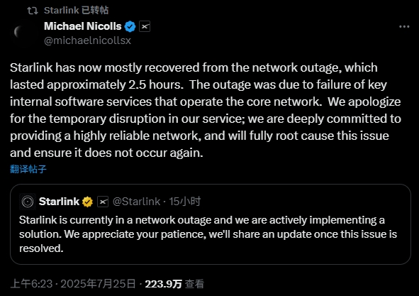 “星鏈”工程副總裁邁克爾·尼科爾斯晚些時候表示,斷網持續約2個半小時,目前已基本恢復。