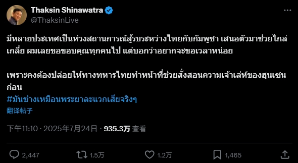 洪森上述表態,是對他信此前聲明的回應。24日晚,他信在社交媒體X平台發文表示:“許多國家關注泰國和柬埔寨之間的戰事,並主動提出協助調解。因此,我謹向大家表示感謝。”