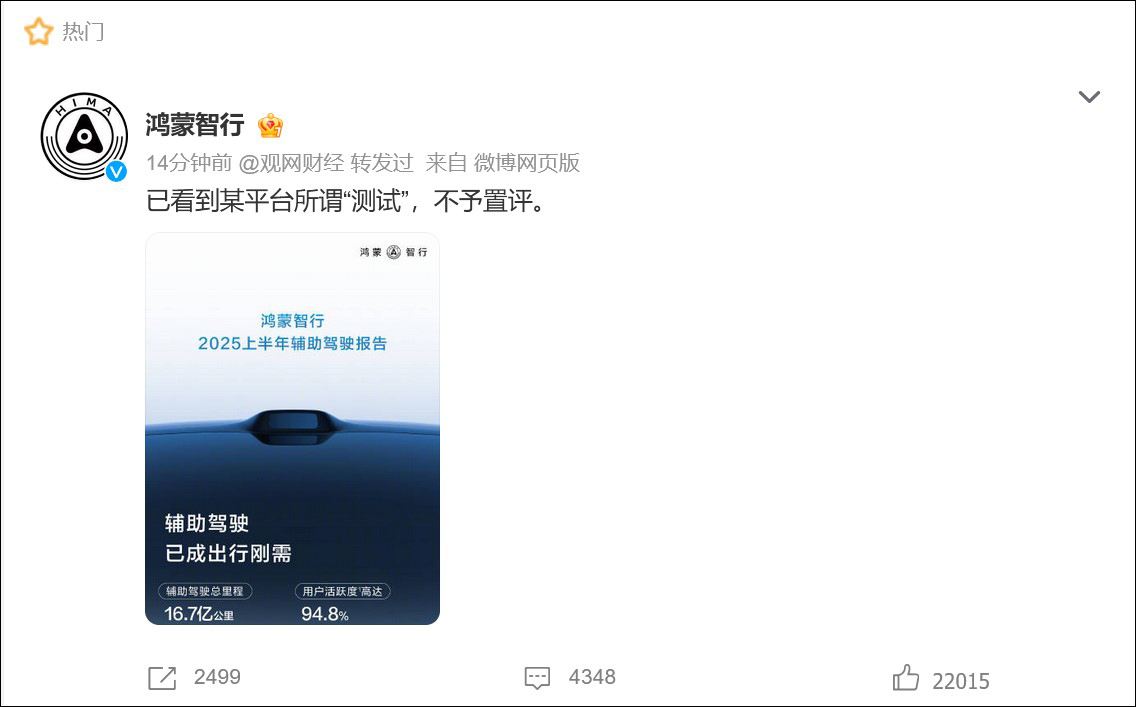懂車帝測試引爭議,鴻蒙智行用數據“回應”