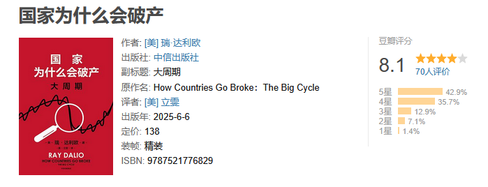 [4]達利歐,2025年,《國家為什麼會破產:大週期》,中信出版社,ISBN: 9787521776829。書籍介紹可見於:https://book.douban.com/subject/37370552/。
