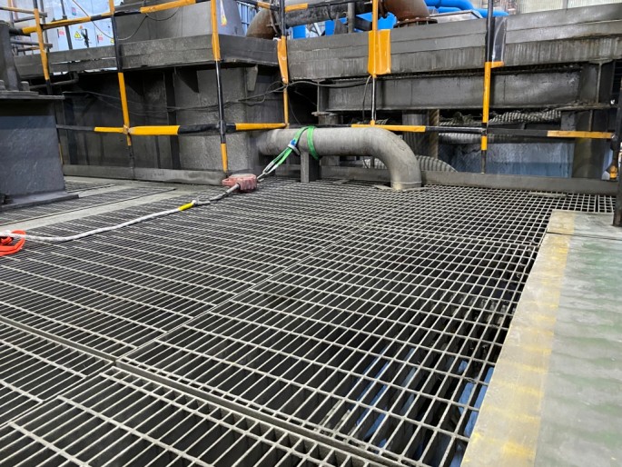 澎湃新聞記者觀察發現,綠色的通道寬度約1米,一側為護欄,一側為格柵板鋪設的平台,格柵板下方即為浮選槽。現場媒體記者和工作人員共計18人,如前方帶隊人員停留介紹,通道內易造成擁擠,如要穿過去,易踩到一旁的格柵板。