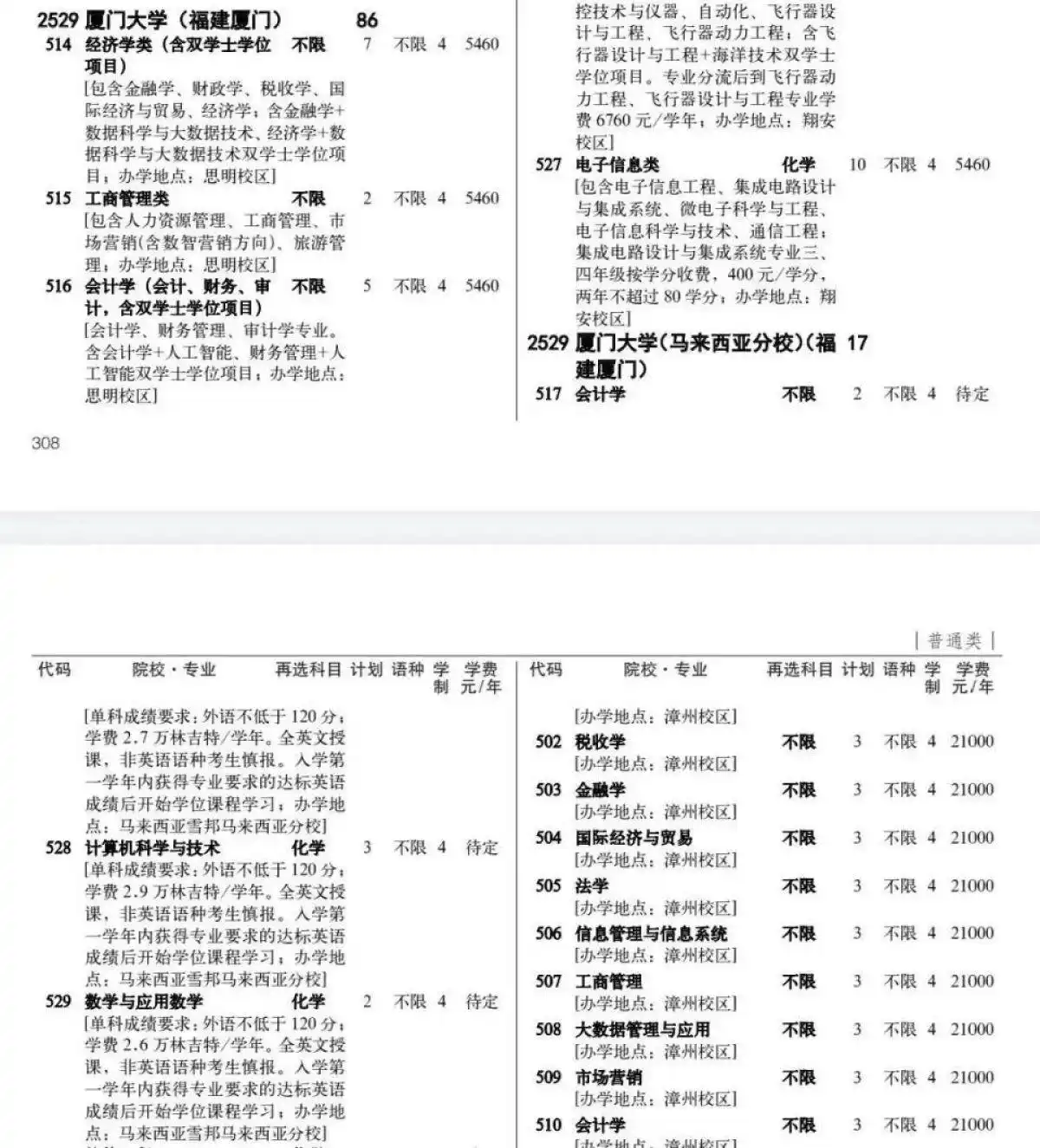 該目錄顯示:廈門大學計算機科學與技術化學專業編號為528,單科成績要求外語不低於120分;學費2.9萬林吉特(約摺合人民幣49000元)/學年。全英文授課,非英語語種考生慎報。入學第一學年內獲得專業要求的達標英語成績後開始學位課程學習;辦學地點:馬來西亞雪邦馬來西亞分校。