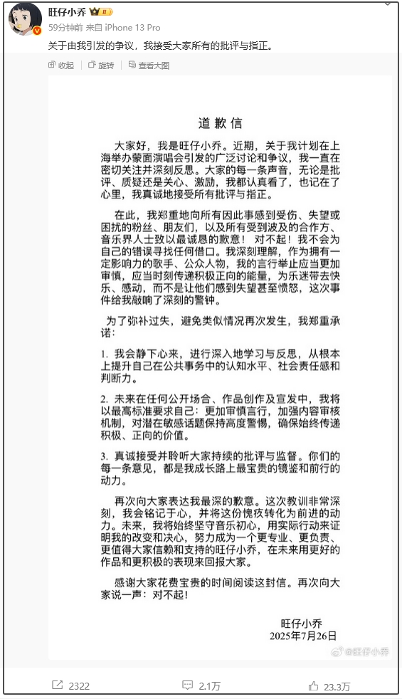 大家好,我是旺仔小喬。近期,關於我計劃在上海舉辦蒙面演唱會引發的廣泛討論和爭議,我一直在密切關注並深刻反思。大家的每一條聲音,無論是批評、質疑還是關心、激勵,我都認真看了,也記在了心裏,我真誠地接受所有批評與指正。