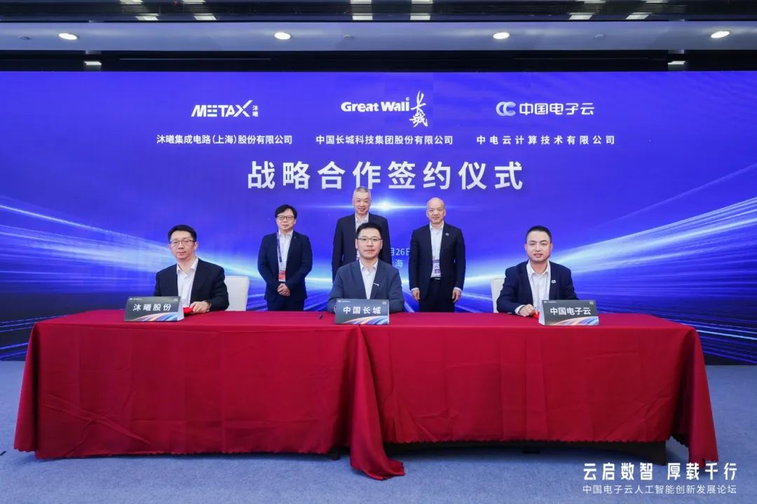 在簽約儀式環節,中國電子雲與中國長城、沐曦股份共同簽署了三方戰略合作儀式;並分別與中國信通院人工智能研究所、上海張江數學研究院、東航數科、南航數科、中國五環、中智股份、僑銀股份簽署相關合作協議。