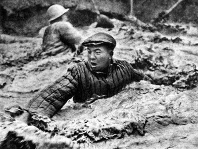 “鐵人”王進喜用身體攪拌泥漿。