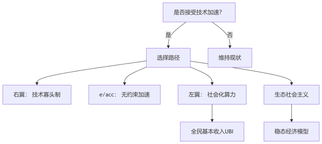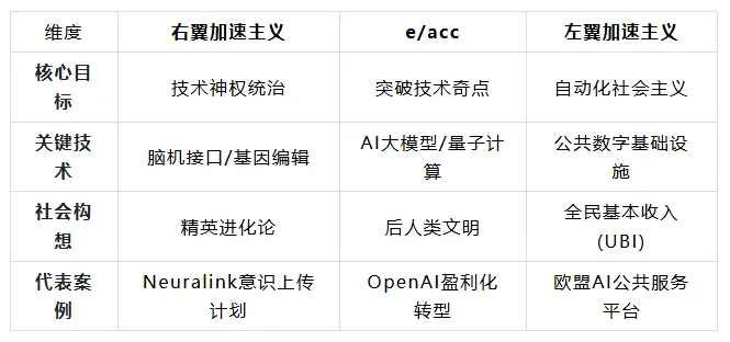 與此同時,技術加速主義內部存在顯著的意識形態分歧。左翼加速主義以斯爾尼塞克與威廉姆斯為代表,主張通過加速資本主義的發展暴露其內在矛盾,最終推動其崩潰並構建後資本主義社會。這一派別認為,技術革命並非單純依賴市場邏輯,而應服務於社會公平與集體福祉,例如通過AI解決資源分配不均等問題。