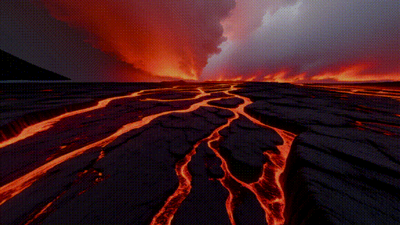 (文生 3D 漫遊場景效果展示:熾熱的岩漿形成河流,在黑色熔岩的地表上流動,蒸汽霧靄)