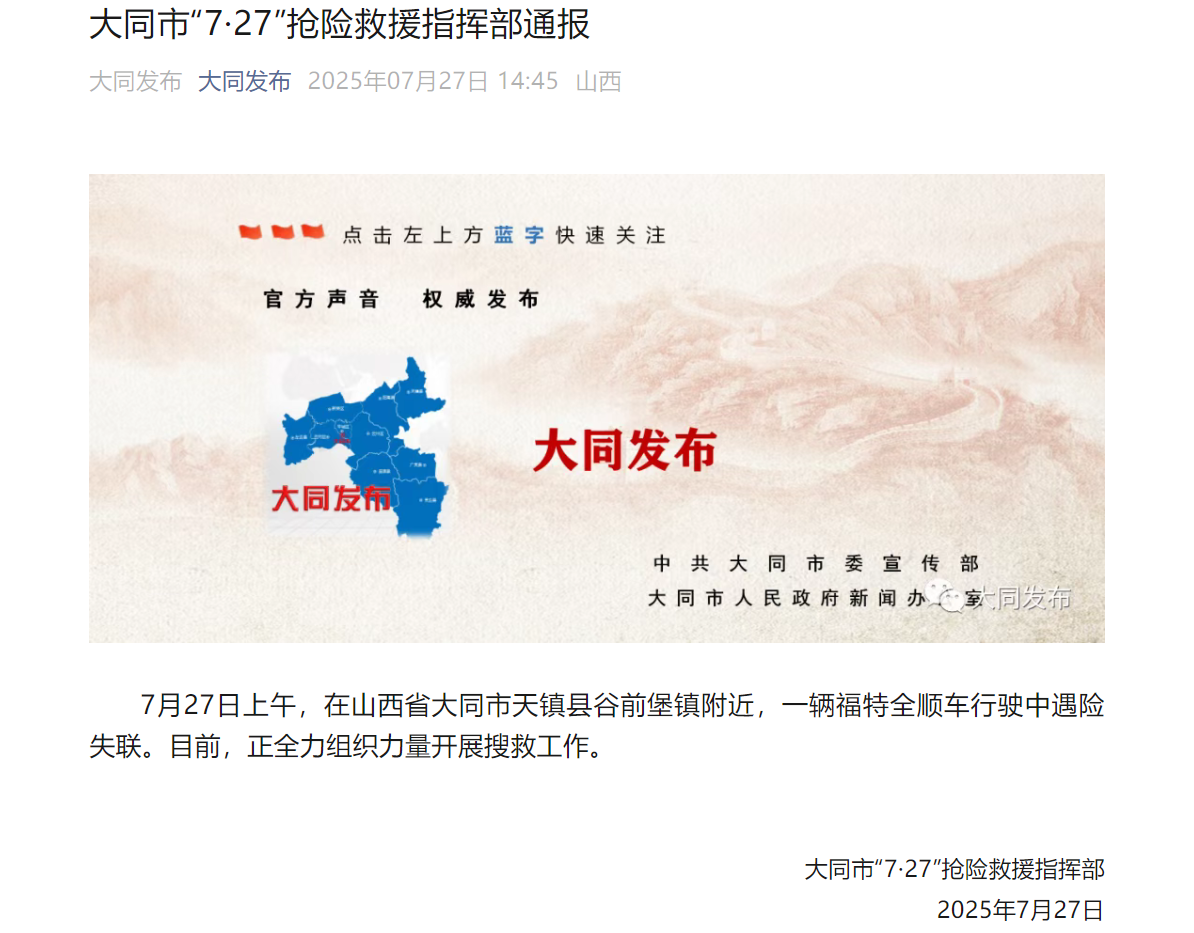 據微信公眾號“大同發佈”消息,山西大同市“7·27”搶險救援指揮部27日通報稱,7月27日上午,在山西省大同市天鎮縣谷前堡鎮附近,一輛福特全順車行駛中遇險失聯。目前,正全力組織力量開展搜救工作。