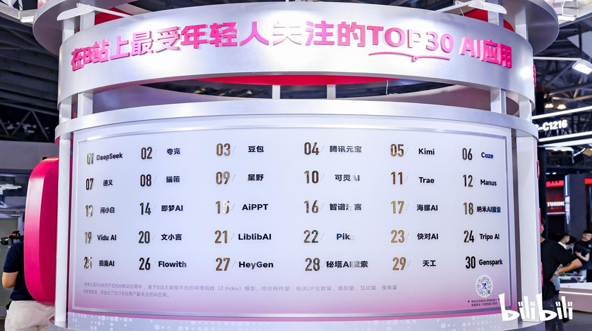 【文/觀察者網 陳思佳】人工智能(AI)技術引發熱潮的當下,國內知名視頻彈幕網站嗶哩嗶哩(以下簡稱“B站”)已成為許多人瞭解AI的重要渠道。在7月26日開幕的2025世界人工智能大會上,B站綜合站內大數據首度發佈“在B站上最受年輕人關注的TOP30 AI應用”,引發關注。