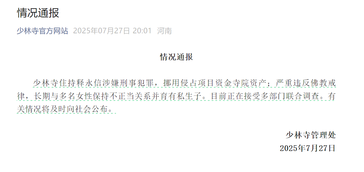 少林寺:釋永信侵佔資金、與多女有染,正接受調查 guancha 2025-07-27 少林寺官方27日通報: 少林寺住持釋永信涉嫌刑事犯罪,挪用侵佔項目資金寺院資產;嚴重違反佛教戒律,長期與多名女性保持不正當關係並育有私生子。目前正在接受多部門聯合調查。有關情況將及時向社會公佈。