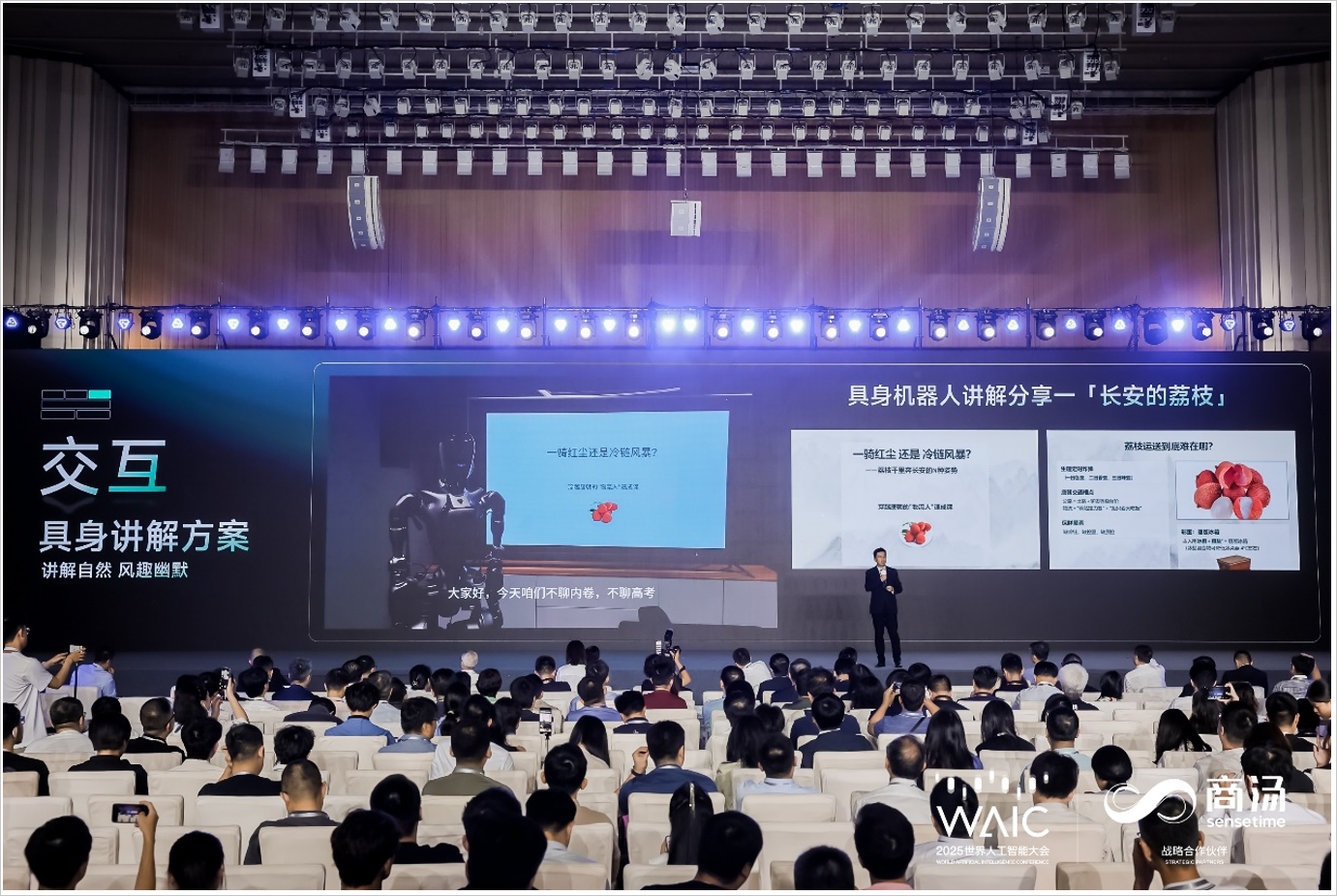 現場,商湯科技董事長兼首席執行官徐立展示了搭載具身世界引擎的人形機器人,生動講解“長安的荔枝”PPT的效果,語言自然,風趣幽默,不僅可以自動翻頁,還能回答各類問題,並進行階段性小結。