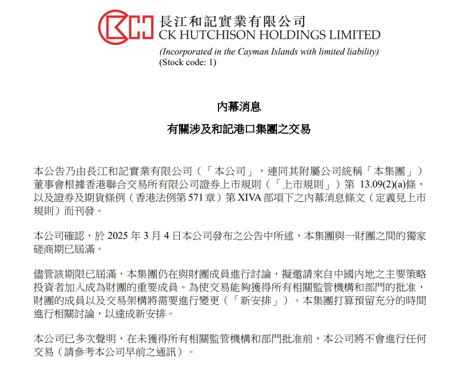 公告稱:公司確認,於2025年3月4日本公司發佈之公告中所述,本集團與一財團之間的獨家磋商期已屆滿。儘管該期限已屆滿,本集團仍在與財團成員進行討論,擬邀請來自中國內地之主要策略投資者加入成為財團的重要成員。為使交易能夠獲得所有相關監管機構和部門的批准,財團的成員以及交易架構將需要進行變更。本集團打算預留充分的時間進行相關討論,以達成新安排。本公司已多次聲明,在未獲得所有相關監管機構和部門批准前,本公司將不會進行任何交易。