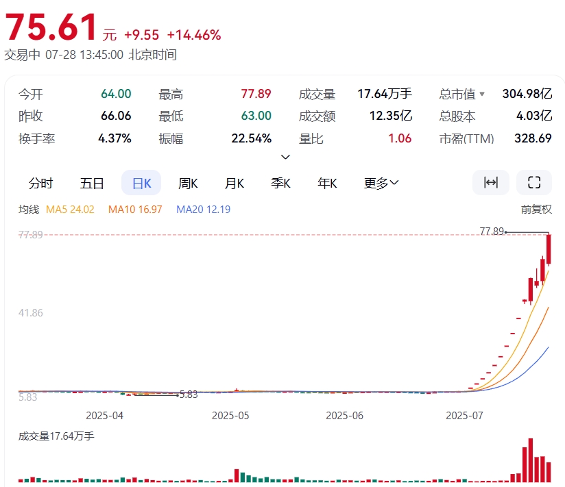 7月28日早盤,上緯新材(SH688585)股價漲幅一度超過11%,再創新高。值得注意的是,截至發稿,該股股價已經超過75元/股,年內累計漲幅已達到10倍以上。這意味着上緯新材成為A股2025年以來首隻10倍股。