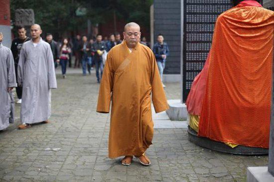 圖為2014年10月1日,河南登封少林寺景區,少林寺方丈釋永信視察各堂口後離開寺廟開放區。澎湃新聞