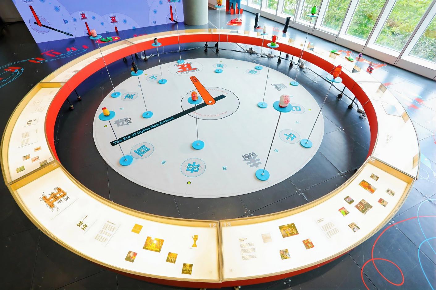 走進展覽館,一個巨大的時鐘裝置映入眼簾。呼應“丑時已到”的主題,時鐘指針停留在“丑時”時區,十二時辰時區分別對應着十二生肖的玩偶——第五屆醜東西大賽的獲獎商品,十二生肖靈性擺件。