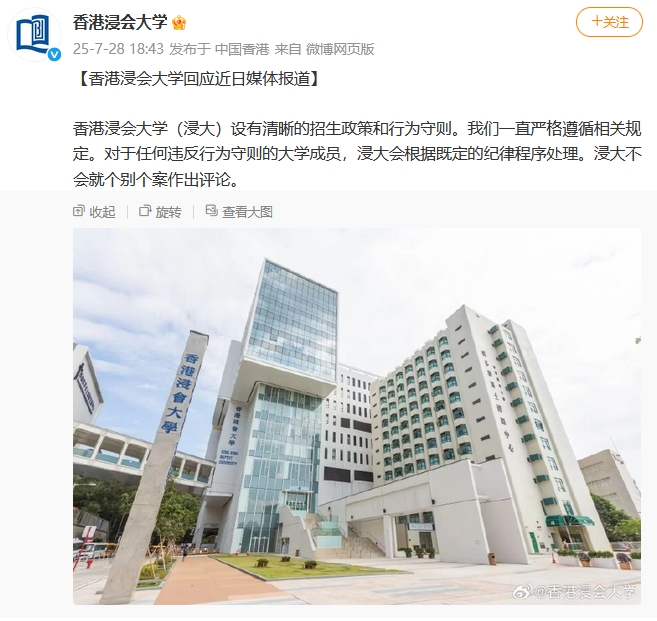 7月28日,@香港浸會大學 回應近日媒體報道:“香港浸會大學(浸大)設有清晰的招生政策和行為守則。我們一直嚴格遵循相關規定。對於任何違反行為守則的大學成員,浸大會根據既定的紀律程序處理。浸大不會就個別個案作出評論。”
