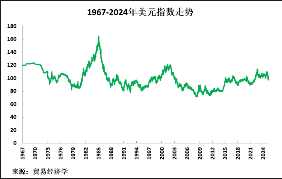 由於美元匯率不僅是反映美國經濟表現的重要指標,更直接影響美國社會政治穩定;加之美元作為全球主導貨幣對世界經濟具有廣泛影響,進而對中國產生直接或間接的連鎖反應,該議題值得密切關注。為此,本文將對近期美元匯率走勢展開詳細分析,尤其注重從歷史視角進行分析,並評估其潛在影響。