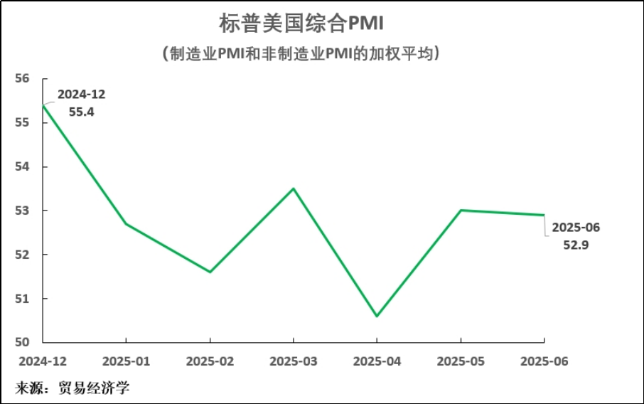 如圖4所示,該PMI從2024年12月的55.4降至2025年6月的52.9。由於該數值高於50,表明6月美國經濟仍在繼續擴張,但漲幅較2024年底有所放緩。
