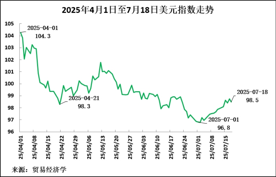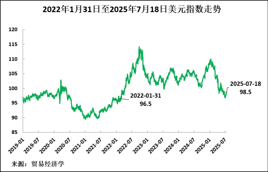 回到當下,自新冠疫情爆發以來,美元一直保持相對強勢,儘管在交易區間內有所波動。如上文的圖13所示,美元指數從2022年1月31日的96.5升至2025年7月18日的98.5。因此,儘管特朗普上任以來美元匯率下跌速度非常迅速,但並未使美元突破其近40年來形成的正常交易區間。