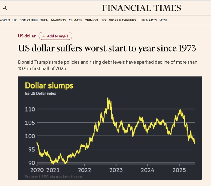 2025年上半年美元指數下跌超過10%,美元面臨1973年以來最糟糕的局面