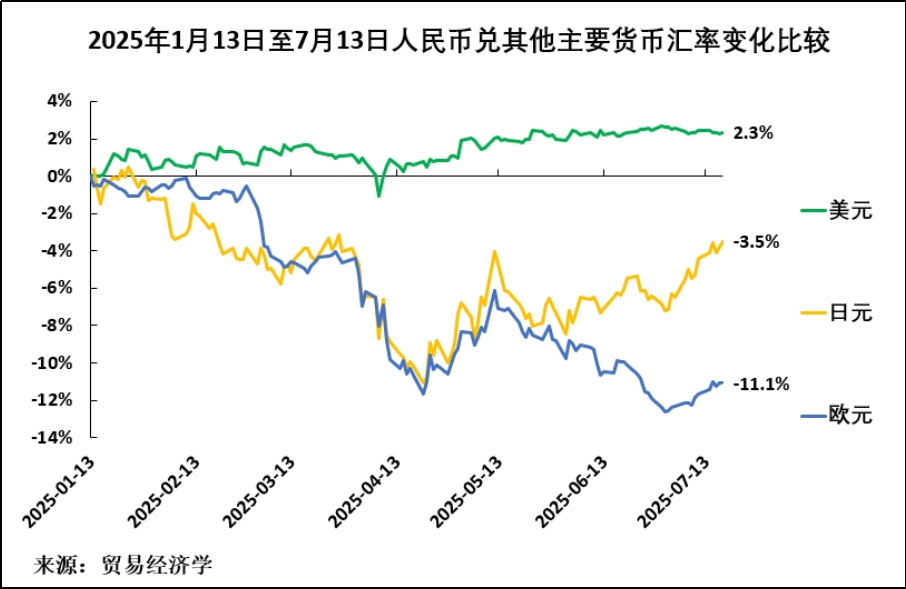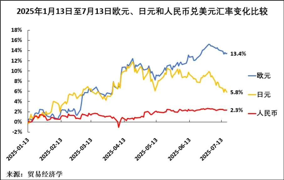 由於中國媒體更關注人民幣兑美元的匯率變動,在美國下跌的同時,人民幣兑美元僅小幅升值,變化很小,這解釋了為何美元匯率下跌及其影響在中國國內的受關注度比較低。但是,就其對世界經濟和中國的影響而言,關鍵在於美元的整體匯率,而不僅僅是美元兑人民幣的匯率。特別是,美元匯率下跌,而人民幣兑美元匯率相對穩定,同時人民幣兑歐元和日元等其他主要貨幣也在貶值,這意味着世界經濟正在分裂為兩大貨幣陣營。