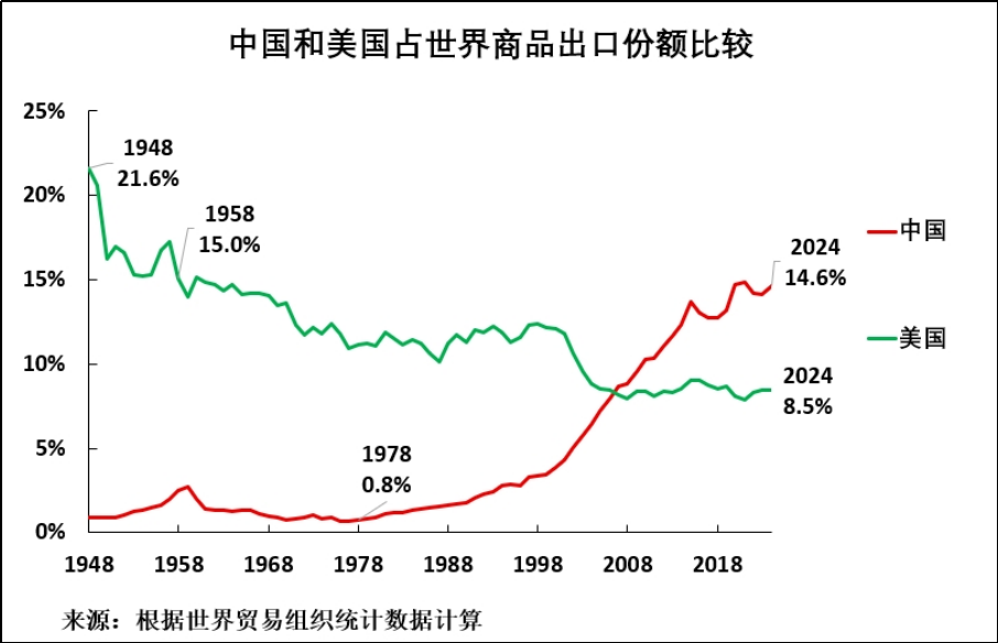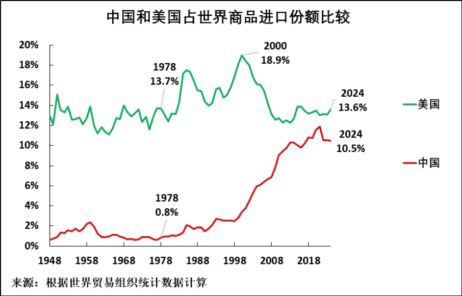 相比之下,中國佔世界商品貿易份額在2013年超過了美國。眾所周知,中國現在是世界上最大的商品貿易國——2024年,中國佔世界商品貿易份額為12.5%,而美國為11.0%。這意味着,如果美國通過加徵關税持續脱離世界貿易體系,那麼中國與其他國家(這些國家合計佔據近90%的世界貿易份額)客觀上具備構建替代美國的世界貿易框架核心的潛力。
