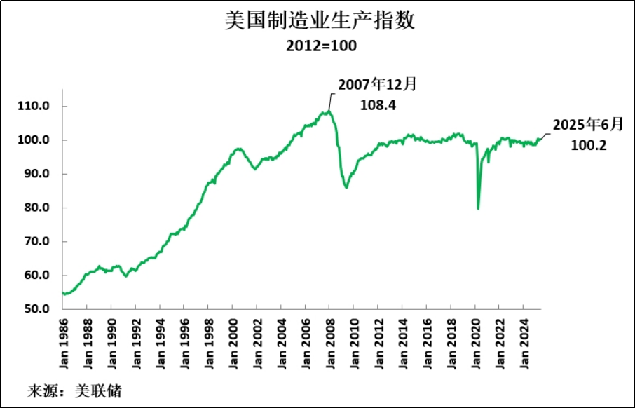 2007年後,受國際金融危機的影響,美國製造業生產狀況進一步惡化,甚至陷入停滯狀態。如圖18所示,美國目前的製造業生產指數低於17年前的水平——截至2025年6月,其指數比2007年12月的峯值低7.6%。針對這一狀況,特朗普誓言要通過關税措施與美元貶值的組合拳來試圖扭轉這一局面。眾所周知,特朗普宣稱的目標是消除或至少大幅減少美國的商品貿易逆差,從而通過減少國際競爭,為美國國內製造業擴大生產創造更大空間。