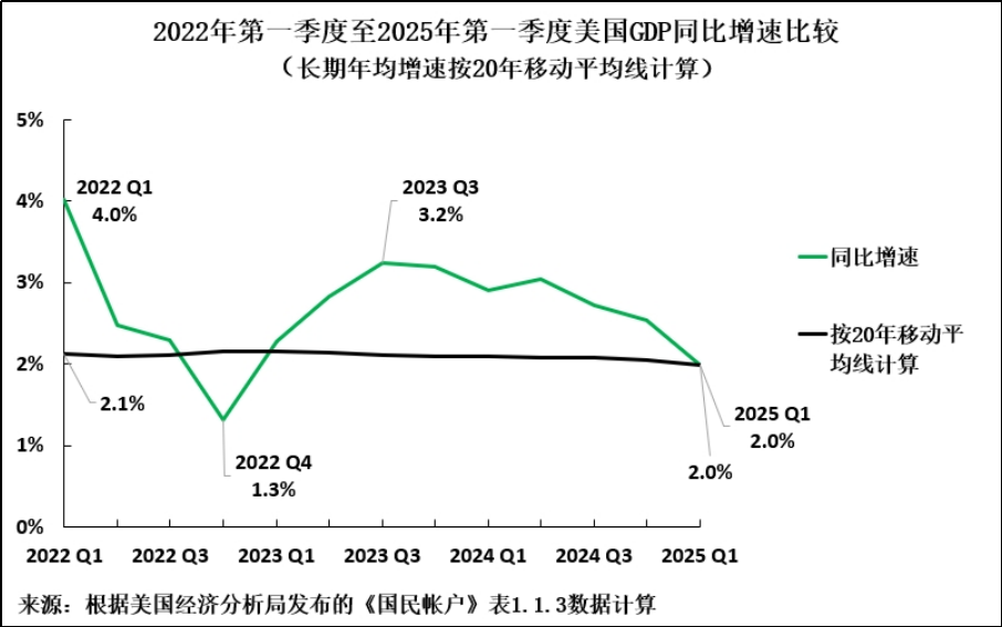 為説明這一點,圖2呈現的是2022年第一季度至2025年第一季度美國GDP增速比較。數據清楚地表明,美國GDP長期年均增速略高於2%。美國經濟近期表現不過是圍繞這一均值上下波動,符合正常的經濟週期變化規律。