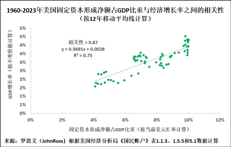 但是,正如筆者所著的諸多文章(例如《“躁鬱症式"分析不可取:什麼是決定中美競爭勝負的關鍵?》)詳細分析的那樣,美國固定資本形成淨額佔GDP比重與經濟增長率之間存在極高的相關性,為0.87 (見圖22)。鑑於此,若特朗普導致美國固定資本形成淨額佔比急劇下降,美國長期/中期經濟增速必將大幅放緩。