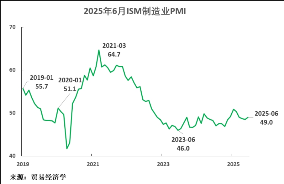 美國其他行業的PMI更為負面。例如,截至2025年6月,美國供應管理協會(ISM)發佈的ISM製造業PMI已降至49.0——該數值低於50表明製造業處於收縮狀態(見圖5)。