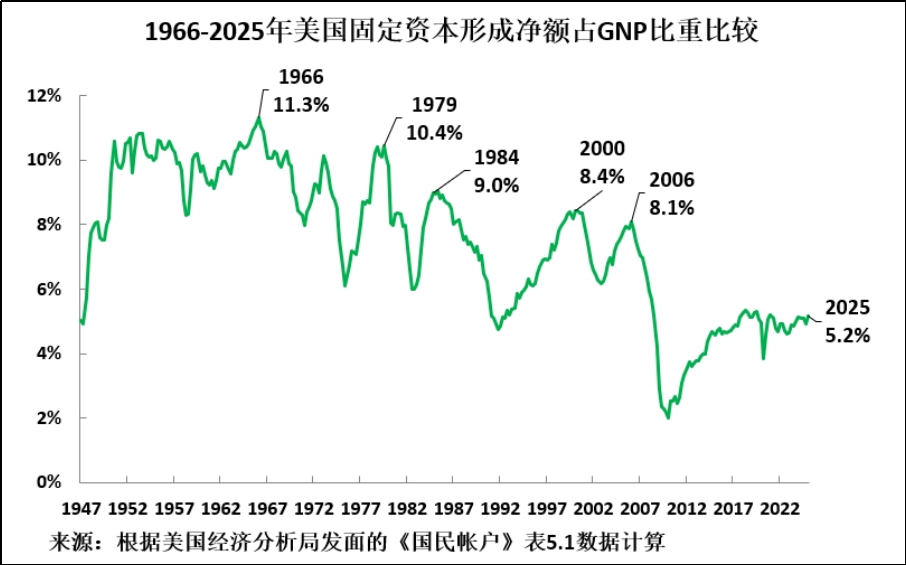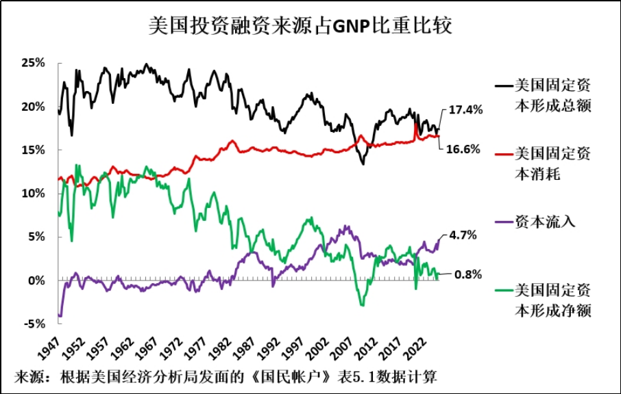 要準確瞭解這些數字,就有必要指出,從國民賬户的角度看,總投資既包括固定資本形成,也包括存貨變動。但實際數據顯示這一數值幾乎完全由固定資本形成主導——2025年第一季度,美國固定資本形成佔GNP比重為21.7%,而存貨增加僅佔0.7%。