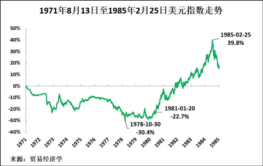 與1971年8月13日決定終止美元與黃金兑換前的最後一個交易日相比,美元指數在1978年10月跌至低點,跌幅達30.4%。到1981年1月20日裏根就職時,美元指數仍比佈雷頓森林體系崩潰時的匯率低22.7%。也就是説,在佈雷頓森林體系崩潰後的十年裏,美元指數一直處於低位。