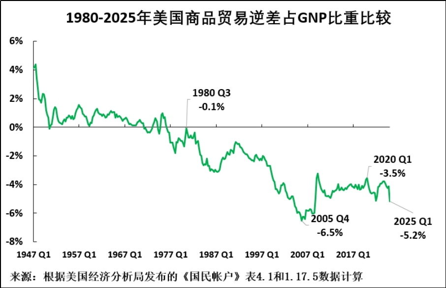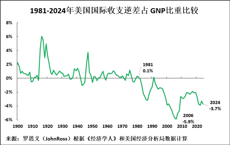 1981年後這一模式徹底逆轉,美國開始出現持續且鉅額的國際收支逆差——2006年國際金融危機前夕,美國國際收支逆差佔GNP比重達到5.9%的峯值,即便到2024年也仍維持3.7%的水平。