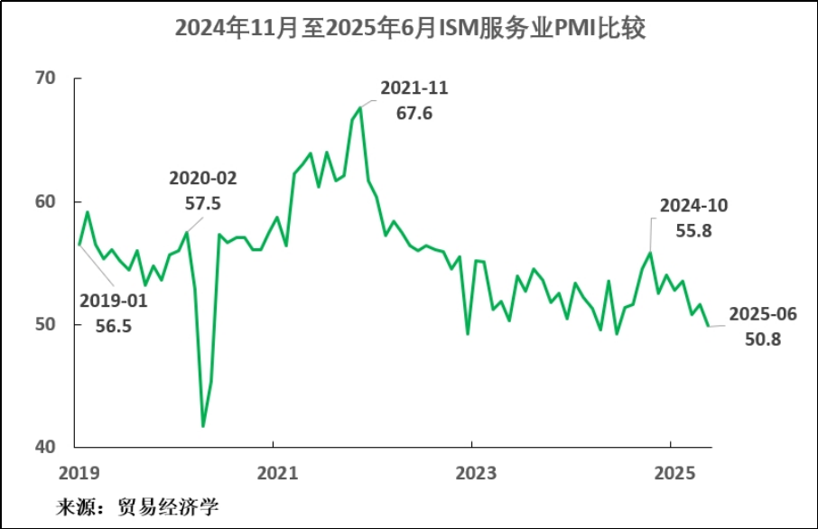 截至2025年6月, ISM服務業PMI已降至50.8,較2024年11月的55.8顯著放緩(見圖6)。