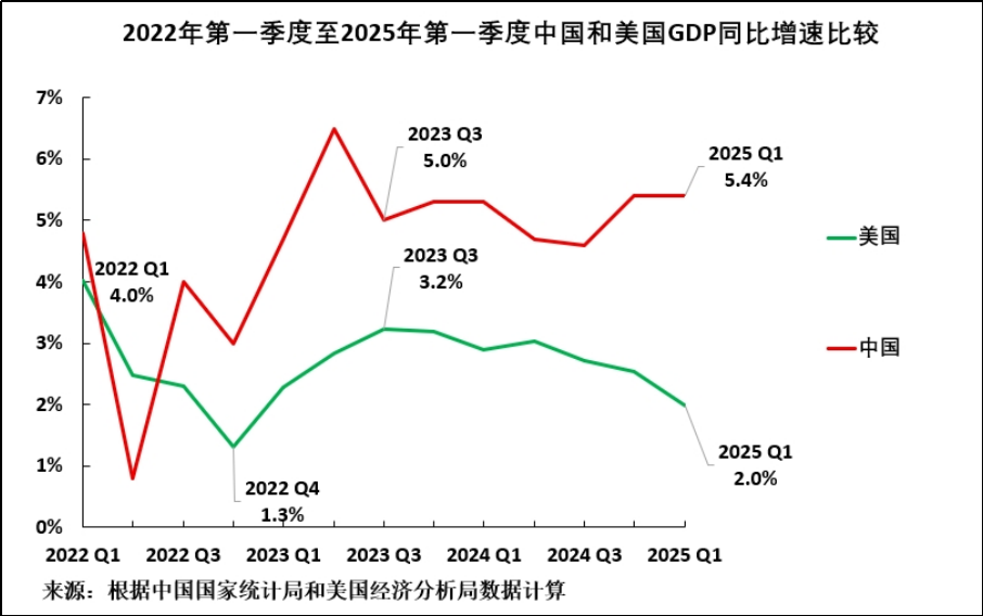 因此到2025年第一季度,中國GDP增速已是美國的2倍有餘。正如筆者在《拜特朗普關税戰所賜,中國對美經濟增速優勢擴大》一文中所預測的,2025年中國對美經濟增速優勢之所以進一步擴大,正是源於美國經濟增長持續放緩。