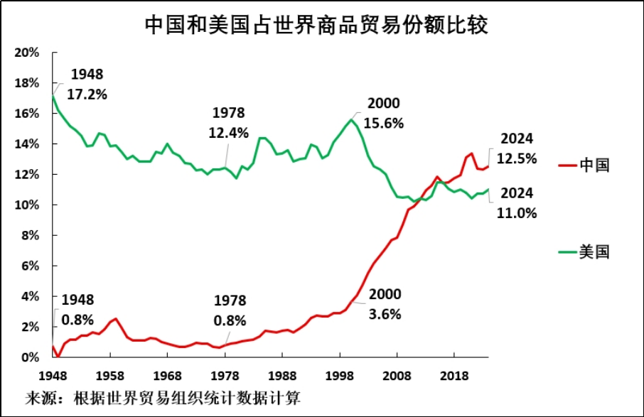 因此,圖9呈現的是自二戰結束後至2024年底期間,美國和中國佔世界商品貿易份額變化比較。可以看出,21世紀以來,美國佔世界商品貿易份額急劇下降——自2000年以來,美國佔世界商品貿易份額已從15.6%降至11.0%。這一11.0%的份額(僅略高於世界貿易總額的十分之一)顯然過小,不足以讓美國控制世界貿易體系,除非其他國家屈從於其要求。