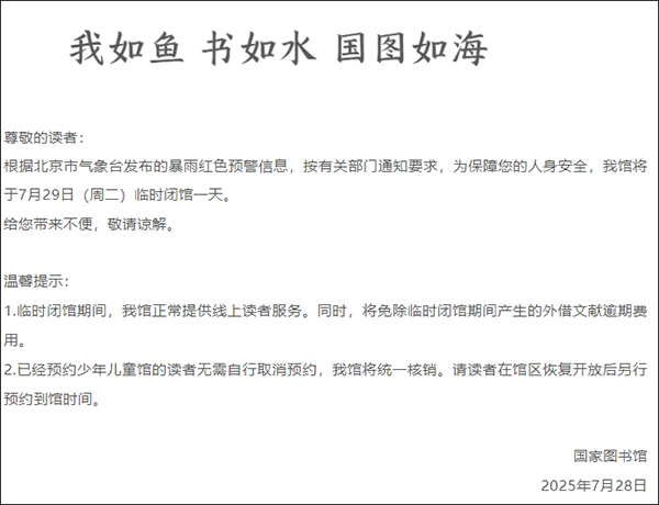 國家圖書館發佈通告宣佈,根據北京市氣象台發佈的暴雨紅色預警信息,按有關部門通知要求,為保障您的人身安全,我館將於7月29日(週二)臨時閉館一天。