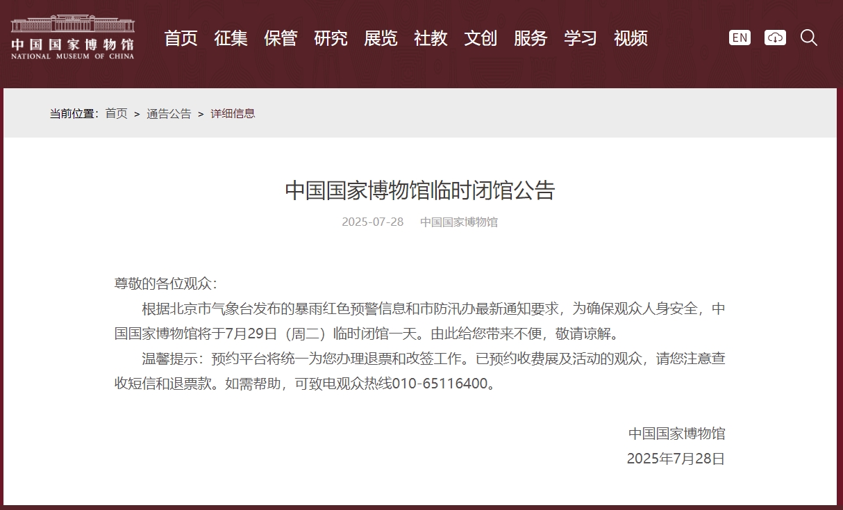 當天,中國國家博物館發佈臨時閉館公告稱,根據北京市氣象台發佈的暴雨紅色預警信息和市防汛辦最新通知要求,為確保觀眾人身安全,中國國家博物館將於7月29日(週二)臨時閉館一天。由此給您帶來不便,敬請諒解。