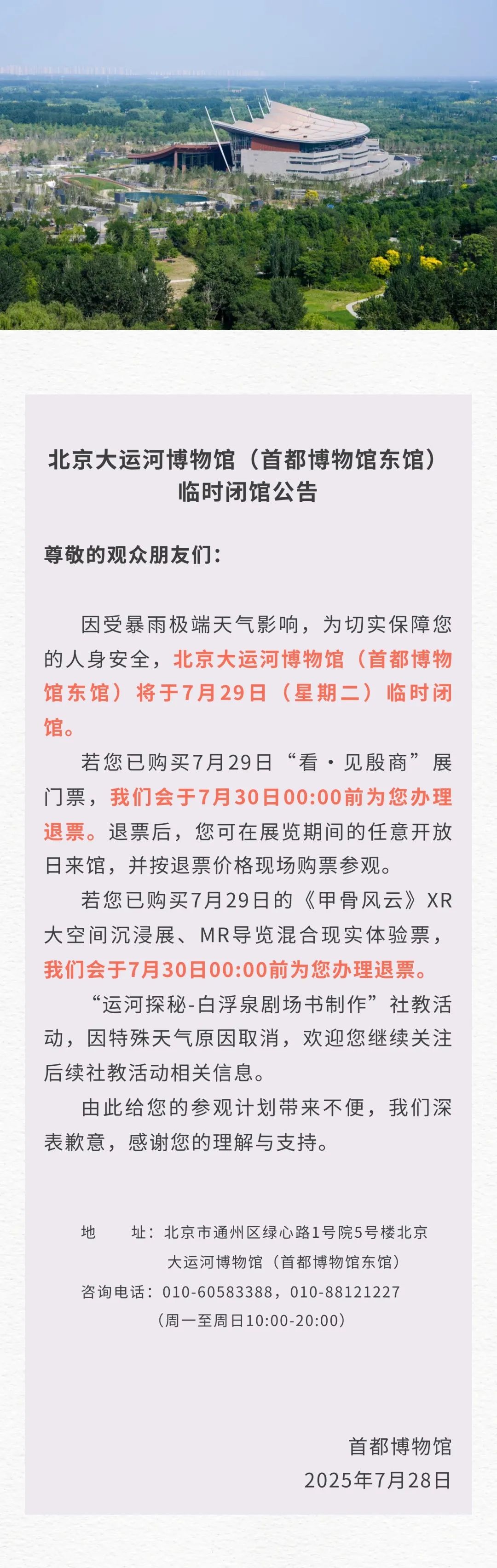 公告表示,因受暴雨極端天氣影響,為切實保障您的人身安全,北京大運河博物館(首都博物館東館)將於7月29日(星期二)臨時閉館。