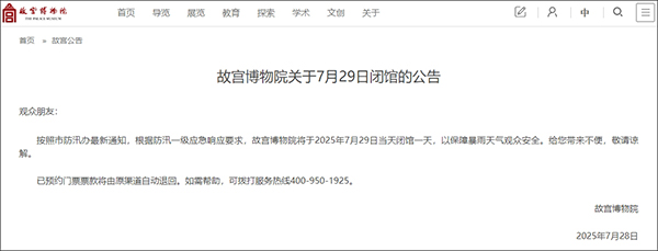 7月28日,故宮博物院發佈關於7月29日閉館的公告。其中稱,按照北京市防汛辦最新通知,根據防汛一級應急響應要求,故宮博物院將於2025年7月29日當天閉館一天,以保障暴雨天氣觀眾安全。給您帶來不便,敬請諒解。