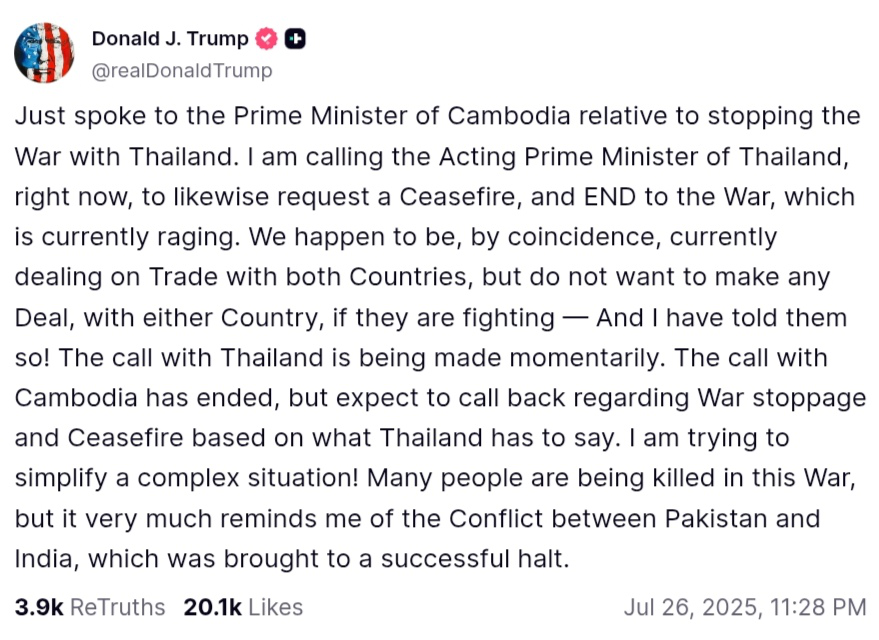 嚴格來説,特朗普那不能叫勸架,而應該叫“綁架”。他強勢要求雙方停火,並且以關税相要挾——你們要是再不停手,就不跟你們籤協議了!泰柬兩國於是“原則上同意停火”,但是前線依舊沒有消停。