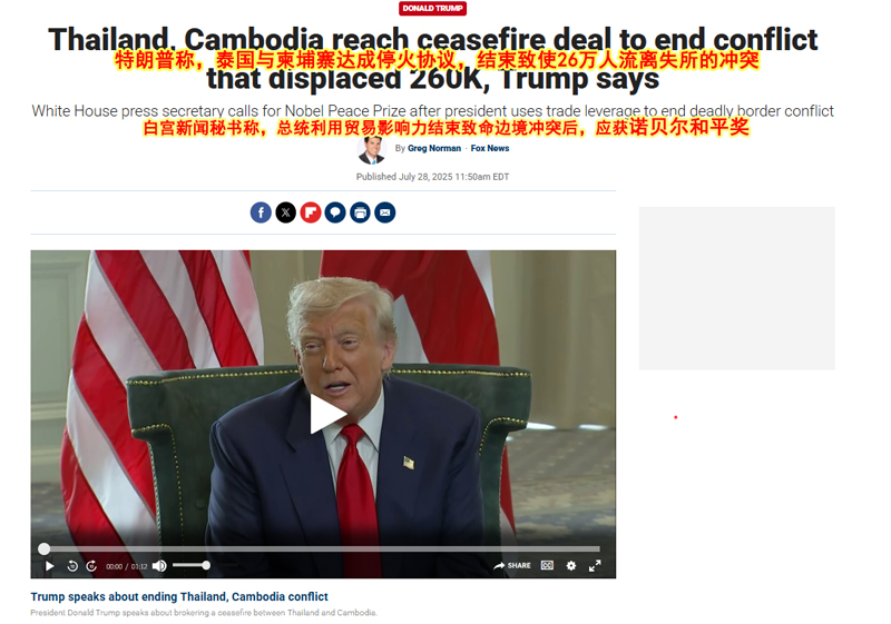 美國媒體,也開始全面進入歌頌模式,無論是官方的“美音”,還是左翼的《紐時》,基本上對泰柬停火的報道,都要標題前加上一個醒目的狀語從句——“在特朗普的干預下,泰柬停戰了!”