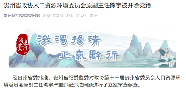 微信公眾號“貴州省紀委監委網站”7月28日發佈通報稱,政協第十一屆貴州省委員會人口資源環境委員會原副主任熊宇被開除黨籍。