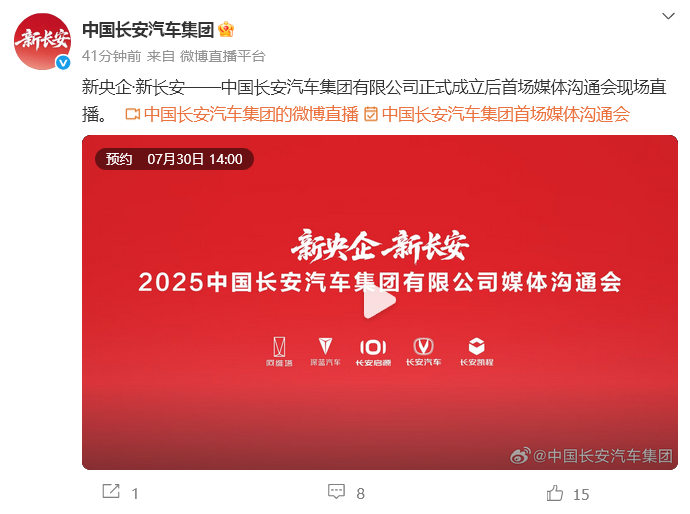 此外,@中國長安汽車集團 的微博賬號也已啓用,第一條微博內容為中國長安汽車集團首場媒體溝通會的現場直播預告。